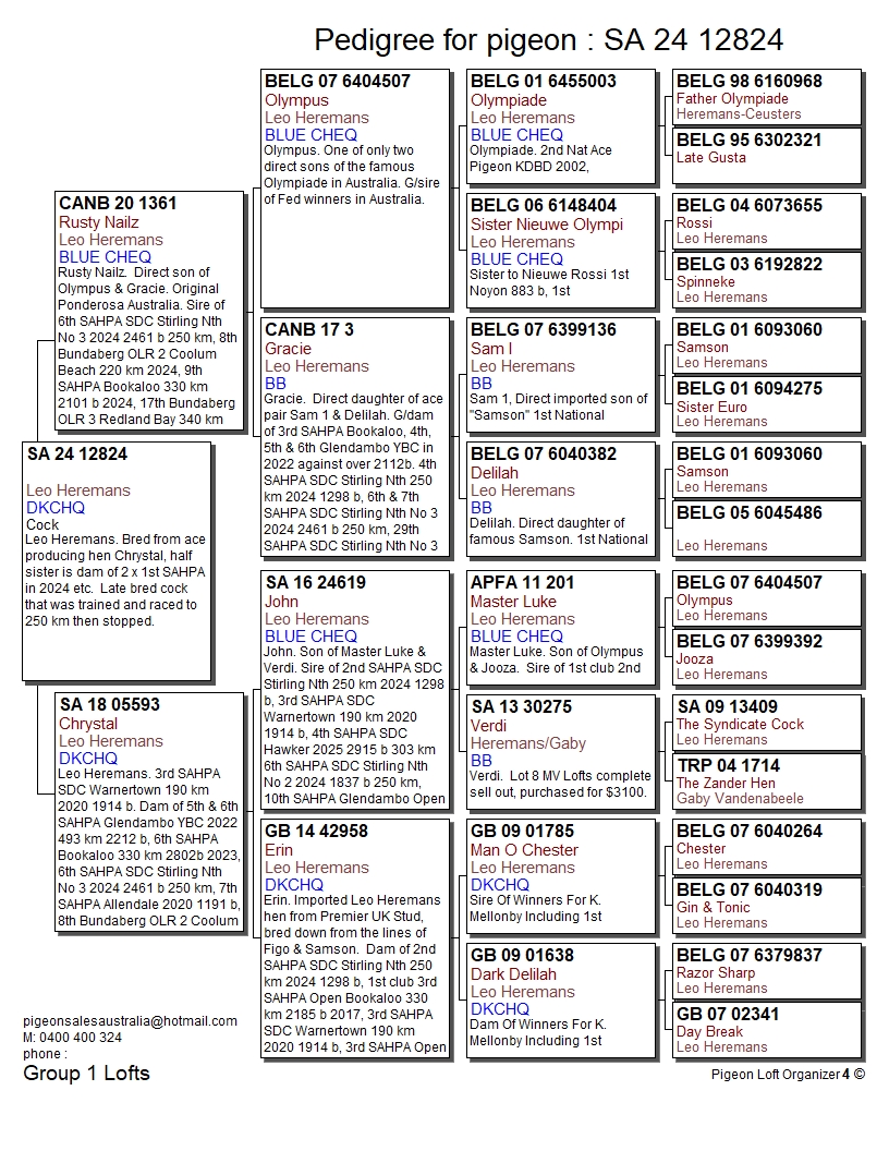 Lot 1:  SA 24 12824 DCC-Leo Heremans. Son of top breeders Rusty Nailz & Chrystal.  Sire is Rusty Nailz, Original Ponderosa Australia and direct son of Olympus & Gracie.  Sire of 6th SAHPA SDC Stirling Nth No 3 2024 2461 b 250 km, 8th Bundaberg OLR 2 Coolum Beach 220 km 2024, 9th SAHPA Bookaloo 330 km 2101 b 2024, 17th Bundaberg OLR 3 Redland Bay 340 km 2024, 29th SAHPA SDC Stirling Nth No 3 2024 2461 b 250 km, 34th SAHPA Lyndhurst YBC 480 km 2141 b 2024, G/sire of 1st Fed Breeza 2023.  Dam is super producer Chrystal daughter of ace birds John & Erin (imported Heremans hen), Chrystal is the best producing daughter of Erin, we raced her gaining 3rd SAHPA SDC Warnertown 190 km 2020 1914 b. Dam of 5th & 6th SAHPA Glendambo YBC 2022 493 km 2212 b, 6th SAHPA Bookaloo 330 km 2802b 2023, 6th SAHPA SDC Stirling Nth No 3 2024 2461 b 250 km, 7th SAHPA Allendale 2020 1191 b, 8th Bundaberg OLR 2 Coolum Beach 220 km 2024, 9th SAHPA Bookaloo 330 km 2101 b 2024, 17th Bundaberg OLR Redland Bay 340 km 2024, 25th SAHPA Open Stirling North 250 km 2023 2415 b., 29th SAHPA SDC Stirling Nth No 3 2024 2461 b 250 km, 34th SAHPA Lyndhurst YBC 480 km 2141 b 2024, 49th SAHPA Allendale East 2020 1305 b., 8th Adelaide PC OLR Pimba 418 km 2022 G/dam of 1st SAHPA The Twins Open #2 2024 1169 b 610 km, 1st SAHPA SDC Stirling Nth No 2 2024 1837 b 250 km, 1st CCF Booligal 1823 b 2025 563 km, 3rd SAHPA SDC Carrieton 246 km 2287 b 2025, 5th SAHPA Lyndhurst 5BS 514 b 480km 2025, 5th SAHPA SDC Hawker 2025 2915 b 303 km, 5th SAHPA SDC Stirling Nth 250 km 2024 1298 b, 7th SAHPA Bookaloo 330 km 2101 b 2024, 8th SAHPA Bookaloo 330 km 2101 b 2024, 8th SAHPA SDC Stirling Nth No 2 2024 1837 b 250 km, 10th GMPF Rankin Springs 2024 487 km 1490 birds, 13th SAHPA Glendambo Open 493 km 2271 b 2024, 14th GMPF Darlington Point 402 km 1818 b 2024, 14th APC OLR Bookaloo 2022 330 km,  15th SAHPA Lyndhurst YBC 480 km 2141 b 2024, 16th SAHPA Lyndhurst YBC 480 km 2141 b 2024, 21st SAHPA Lyndhurst YBC 480 km 2141 b 2024, 28th SAHPA Glendambo YBC 2023 2710 b 493 km, 25th & 32nd APC OLR Glendambo 2022 500 km, 27th Adelaide PC OLR The Twins 610 km 2022, 43rd SAHPA Coober Pedy 725 km 1362 b 2023. G/G Dam of 14th SAHPA Coober Pedy 2025 1093 b 726 km 11 Hr fly 1102 mpm.  Super Result birds.