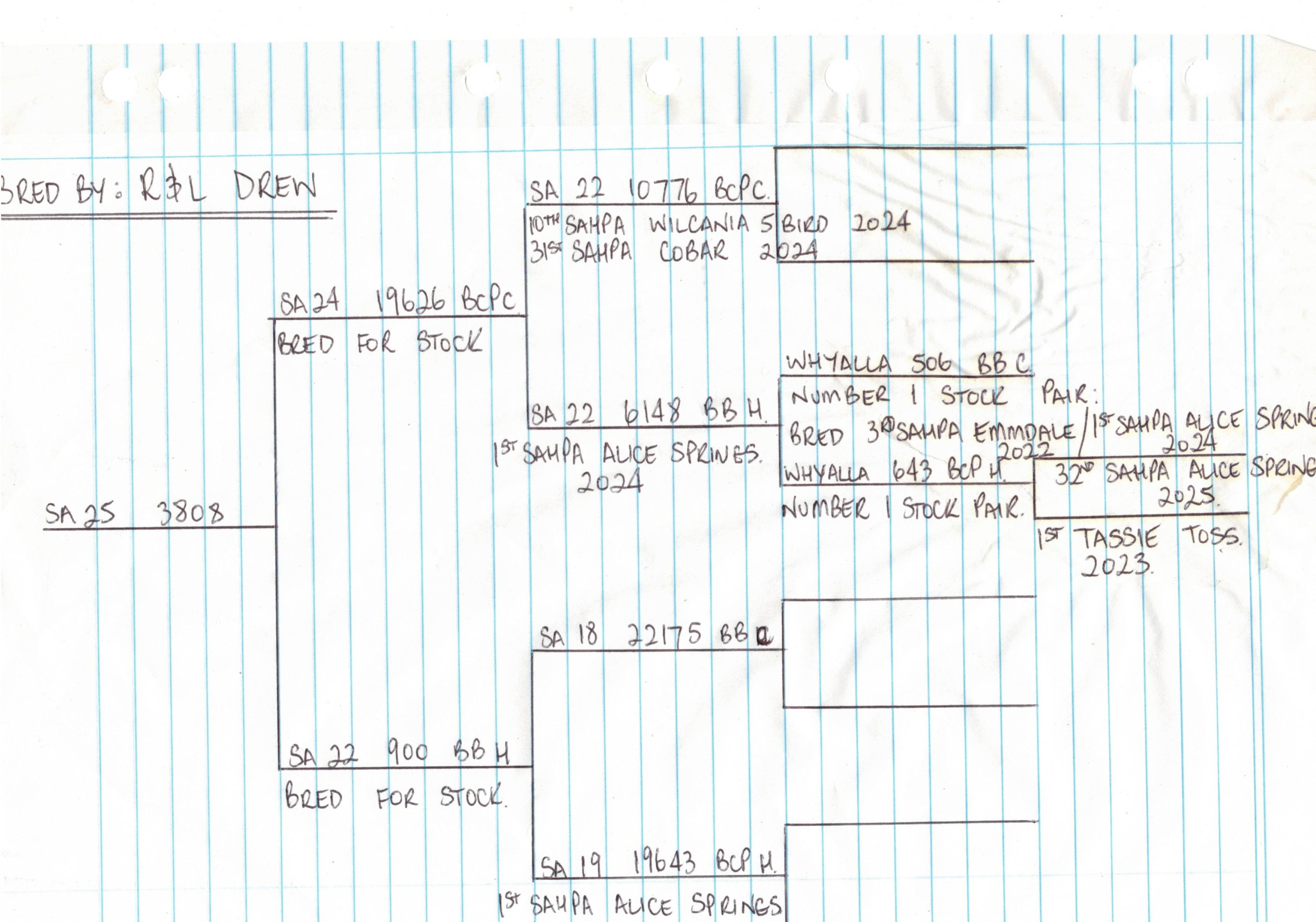 Lot 1:  SA 25 3808  -R&L Drew (Squeaker)-Grandchild of both Alice Springs winners from 2022 & 2024.  Sire is direct son of double SAHPA placed cock on NE Line in 2024 when paired with 1st SAHPA LDC Alice Springs 2024 both parents are from No 1 stock pair.  Dam is daughter of 1st SAHPA LDC Alice Springs from 2022.