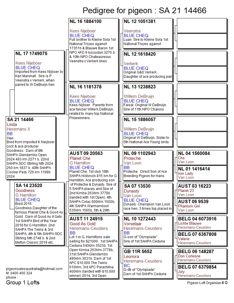 Lot 10:  SA 21 14466 BBH-Linda.  Top producing hen.  Bred from imported K Neijboer cock & ace producer Goodness.  Dam of 8th SAHPA Glendambo Open 2024 493 km 2271 b, 22nd SAHPA SDC Stirling Nth 2024 250 km 1837 b, 40th SAHPA Coober Pedy 726 km 1199b 2024.  Sire is imported Kees Neijboer cock imported by Ken Marshall and loaned to us who contains the potent Veenstra, Verkerk and Willem De Bruin lines.  Dam is Goodness. Daughter of the famous Planet Che & Good As Gold.  Dam of Good As it Gets 1st SAHPA Bird of the Year 2018 for G Hamilton. 2nd SAHPA The Twins & 3rd SAHPA, 4th & 5th SAHPA SDC Stirling Nth 2748 b. & 2nd Melton Classic 2019 etc. G/Dam of 1st SAHPA Glendambo Open 493 km 2271 b 2024, 1st SAHPA Bird of the Year 2020, 1st SAHPA LDC Coober Pedy Cock Special 2021 720 km, 3rd SAHPA Allendale East 2020 417 km 1191 b, 3rd SAHPA SDC Stirling Nth No 3 2024 2461 b 250 km, 5th SAHPA Allendale East 2020 417 km 1305 b, 1st SAHPA Vin Blanden Memorial Race winner 2020, 1st club 5th SAHPA Glendambo YBC 2023 2710 b 493 km, 7th SDC SAHPA Stirling Nth # 2 2024, 280 Km, 1446mpm, 1837 birds, 8th SAHPA Glendambo Open 493 km 2271 b 2024, 8th SAHPA Bookaloo 2023 330 km 2802 b, 11th SAHPA Bookaloo 330 km 2101 b 2024, 21st SAHPA The Twins Open #2 2024 1169 b 610 km,  24th SAHPA Glendambo Open 493 km 2271 b 2024 , 24th SAHPA Bookaloo 2023 330 km 2802 b, 26th SAHPA Marree 5 Bird Special 2021 553 km,  6th Meadow OLR Robinvale 455 km 2021, 18th GC 50000 Race 3 Tiaro 243 km 2021, 22nd SAHPA SDC Stirling Nth No 2 2024 1837 b 250 km, 32nd GC 50000 Race 2 Kybong 178 km 2021, 34th SAHPA SDC Stirling Nth No 2 2024 1837 b 250 km, 1st club Marree Open 553km 2021, 40th SAHPA Coober Pedy 726 km 1199 b 2024, G/G Dam of 1st SAHPA SDC Hawker 2025 2915 b 303 km, 1st CCF Booligal 1823 b 2025 563 km, 2nd SAHPA LDC Coober Pedy Cock Special 2021 720 km, 2nd VHA Kurting 237 km 2244 b 2025, 6th & 7th SAHPA Coober Pedy 726 km 1199b 2024, 7th SAHPA Bookaloo 330 km 2101 b 2024, 14th APC OLR Bookaloo 2023, 21st SAHPA Little Topar Open 452 km 1762b 2024, 21st SAHPA Lyndhurst YBC 480 km 2141 b 2024, 26th SAHPA Coober Pedy 2025 1093 b 726 km 11 Hr fly 1102 mpm, 27th SAHPA Cobar 760 km 2024 496 b. This hen has a reserve price of $1000.