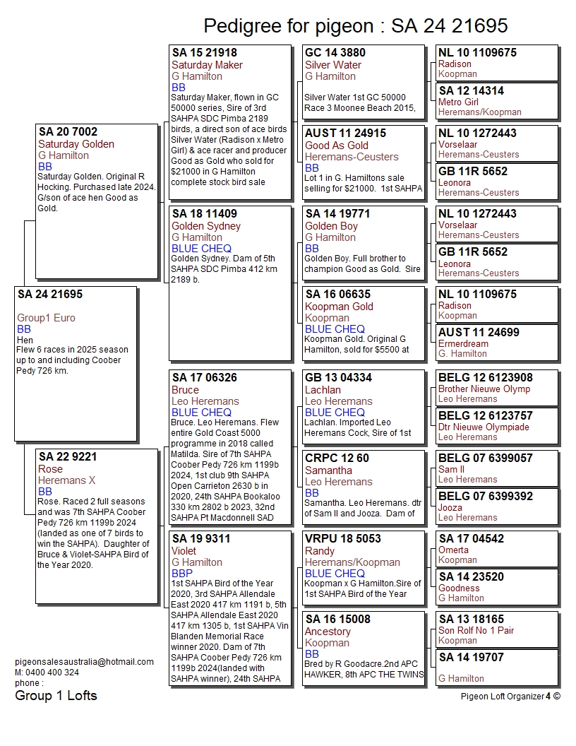 Lot 14:  SA 24 21695 BBH- Flew 6 races in 2025 season up to and including Coober Pedy 726 km. Sire is Saturday Golden. Original R Hocking. Purchased late 2024. G/son of ace hen Good as Gold.  Dam is Rose. Raced 2 full seasons and was 7th SAHPA Coober Pedy 726 km 1199b 2024 (landed as one of 7 birds to win the SAHPA).  Daughter of Bruce & Violet-SAHPA Bird of the Year 2020.