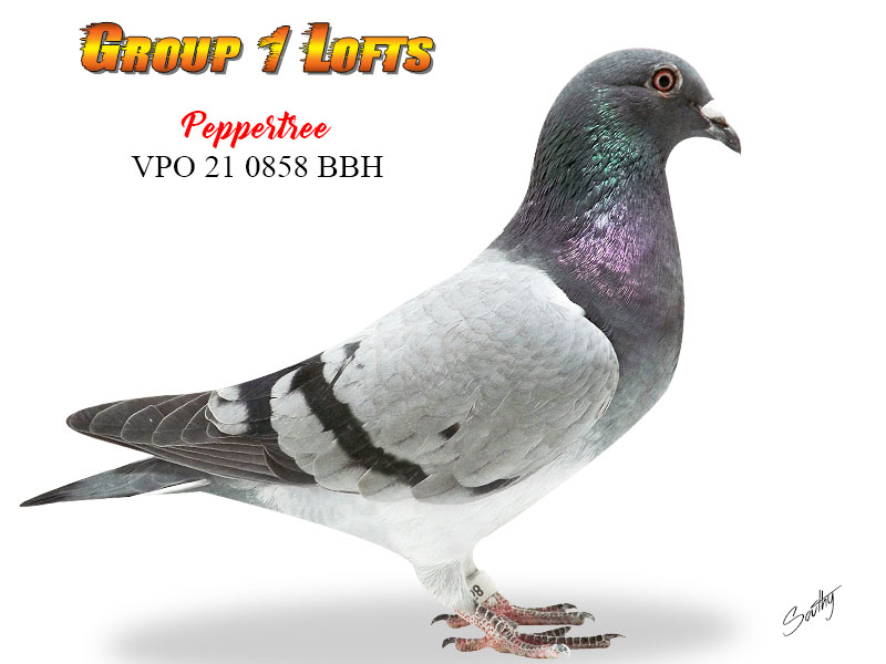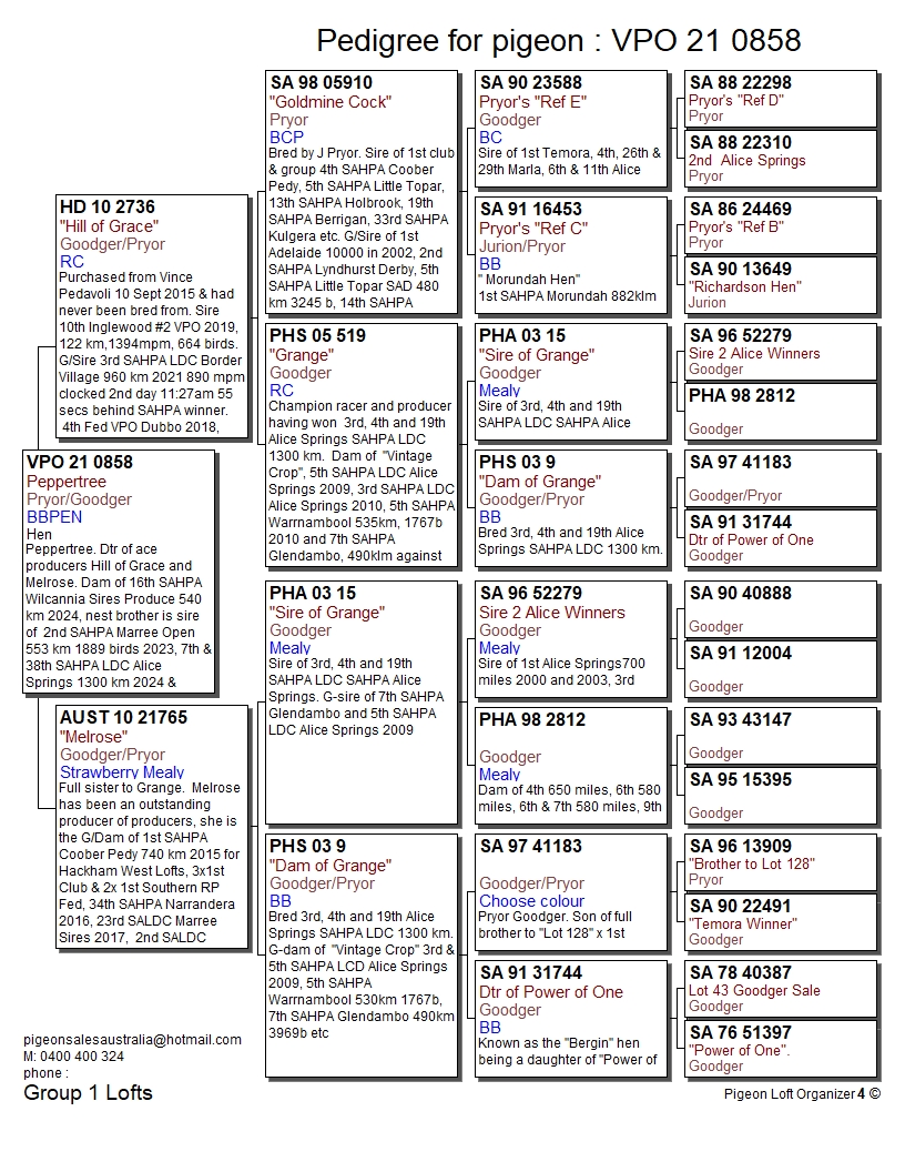 Lot 16: VPO 21 0858 BBH-Peppertree. Dtr of ace producers Hill of Grace and Melrose. Dam of 16th SAHPA Wilcannia Sires Produce 540 km 2024, nest brother is sire of 2nd SAHPA Marree Open 553 km 1889 birds 2023 7th & 38th SAHPA LDC Alice Springs 2024 & 2025. Sire is Hill of Grace a direct son of the famous Goldmine cock & Grange. Dam is Melrose ace producing full sister to Grange. This hen is Long Distance Blue Blood royalty. This hen has a reserve price of $1500.