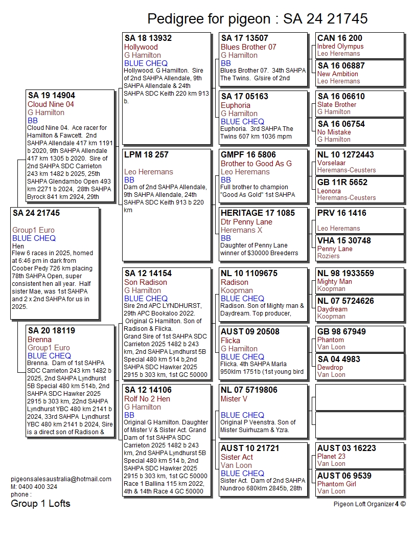 Lot 17:  SA 24 21745 BCH- Flew 6 races in 2025, homed at 6:46 pm in dark from Coober Pedy 726 km placing 78th SAHPA Open, super consistent hen all year.  Half-sister Mae, was 1st SAHPA and 2 x 2nd SAHPA for us in 2025.  Sire is Cloud Nine 04.  Ace racer for Hamilton & Fawcett.  2nd SAHPA Allendale 417 km 1191 b 2020, 9th SAHPA Allendale 417 km 1305 b 2020.  Sire of 2nd SAHPA SDC Carrieton 243 km 1482 b 2025, 25th SAHPA Glendambo Open 493 km 2271 b 2024,  28th SAHPA Byrock 841 km 2924, 29th SAHPA Cobar 750 km 2024 496 b, 43rd SAHPA Pimba 412 km 2873 b 2023.  Dam is Brenna.  Dam of 1st SAHPA SDC Carrieton 243 km 1482 b 2025, 2nd SAHPA Lyndhurst 5B Special 480 km 514b, 2nd SAHPA SDC Hawker 2025 2915 b 303 km, 22nd SAHPA Lyndhurst YBC 480 km 2141 b 2024, 33rd SAHPA  Lyndhurst YBC 480 km 2141 b 2024, Sire is a direct son of Radison & Flicka, dam is his traditional mate 14106 and together, they are grandparents of 3 APC OLR winners.