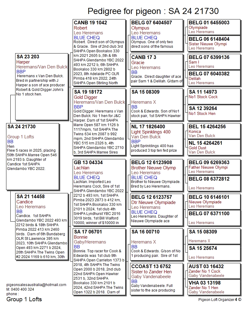 Lot 18: SA 24 21730 BBH- Flew 5 races in 2025, placing 50th SAHPA Marree Open 546 km 2193 b. Dropped end flight so unable to send to Coober Pedy Open.  Daughter of Candice 1st SAHPA Glendambo YBC 2022 & G/dtr of No 1 pair Lachlan & Bonnie. Sire is Harper,  Heremans x Van Den Bulck. Bred in partnership with J Harper a son of ace producer Robert & Gold Digger John's No 1 stock hen. Dam is Candice. 1st SAHPA Glendambo YBC 2022 493 km 2212 birds & 18th SAHPA Pimba 2022 413 km 2460 birds. Dam of 6th Bundaberg OLR St Lawrence 395 km 2023, 10th SAHPA Glendambo Open 493 km 2271 b 2024, 26th SAHPA The Twins Open #2 2024 1169 b 610 km, 30th SAHPA Glendambo YBC 2023 2710 b 493 km. Daughter of No 1 Pair Lachlan & Bonnie, who have produced 3 x 1st SAHPA winners. Outstanding young hen.