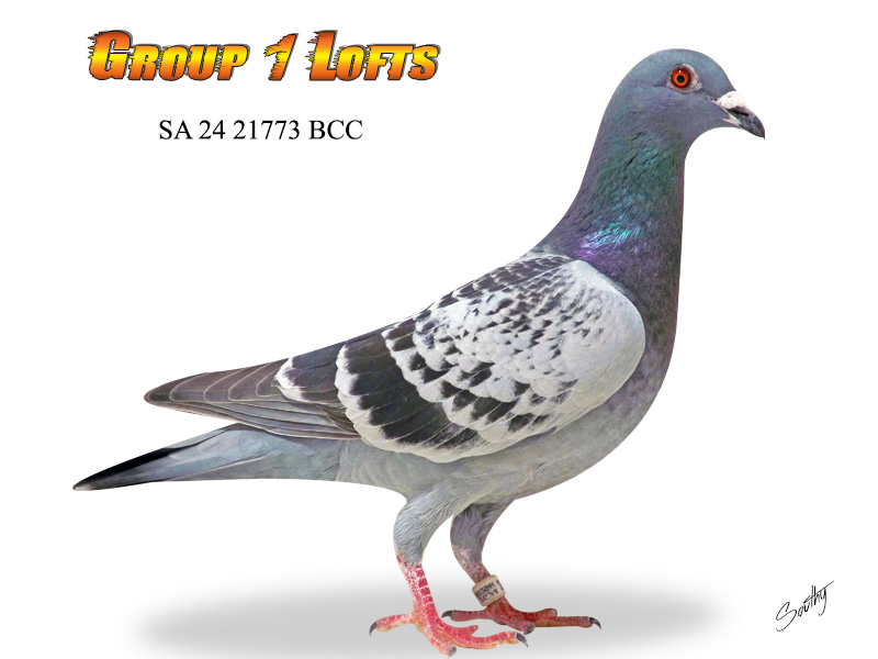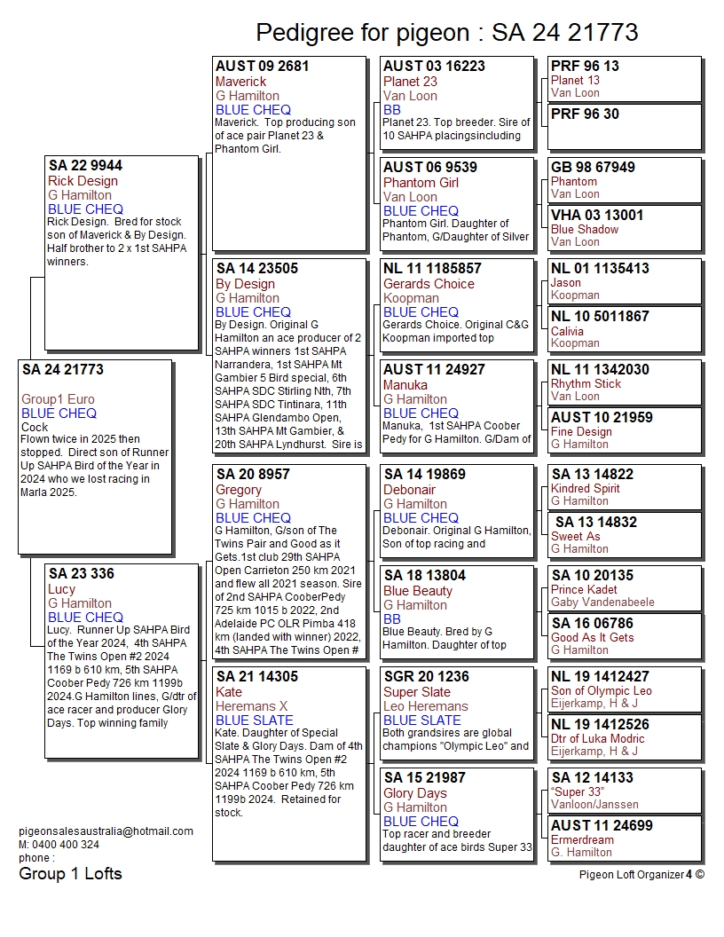 Lot 2:  SA 24 21773 BCC-G Hamilton Lines.  Flown twice in 2025 then stopped.  Direct son of Runner Up SAHPA Bird of the Year in 2024 who we lost racing in Marla 2025.  Sire is Rick Design, original Ross Hocking,  Bred for stock son of Maverick & By Design.  Half brother to 2 x 1st SAHPA winners. Dam is Lucy, Runner Up SAHPA Bird of the Year 2024,  4th SAHPA The Twins Open #2 2024 1169 b 610 km, 5th SAHPA Coober Pedy 726 km 1199b 2024.G Hamilton lines, G/dtr of ace racer and producer Glory Days and her sire is a top producing g/son of the famous Twins Pair. Top winning family.
