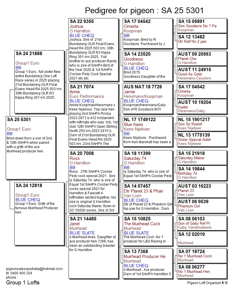 Lot 2:  SA 25 5301 & 5302 Both BBs-Group 1 Lofts (Pair of Squeakers).  Sire is son of Joshua & Annie, Joshua is direct son of ace pair Omerta & Goodness, Annie is 2nd SAHPA & 12th SAHPA in 2023 and is bred from a son of Goodness paired to imported ace producing Kees Nijebour hen.  Dam is bred from R Hocking cock 7008 all top G Hamilton lines when paired with a daughter of ace Muirhead pair, dam is the Muirhead producer hen dam, granddam & g/g dam of SAHPA winners.