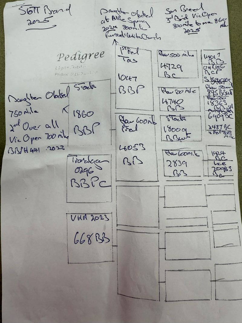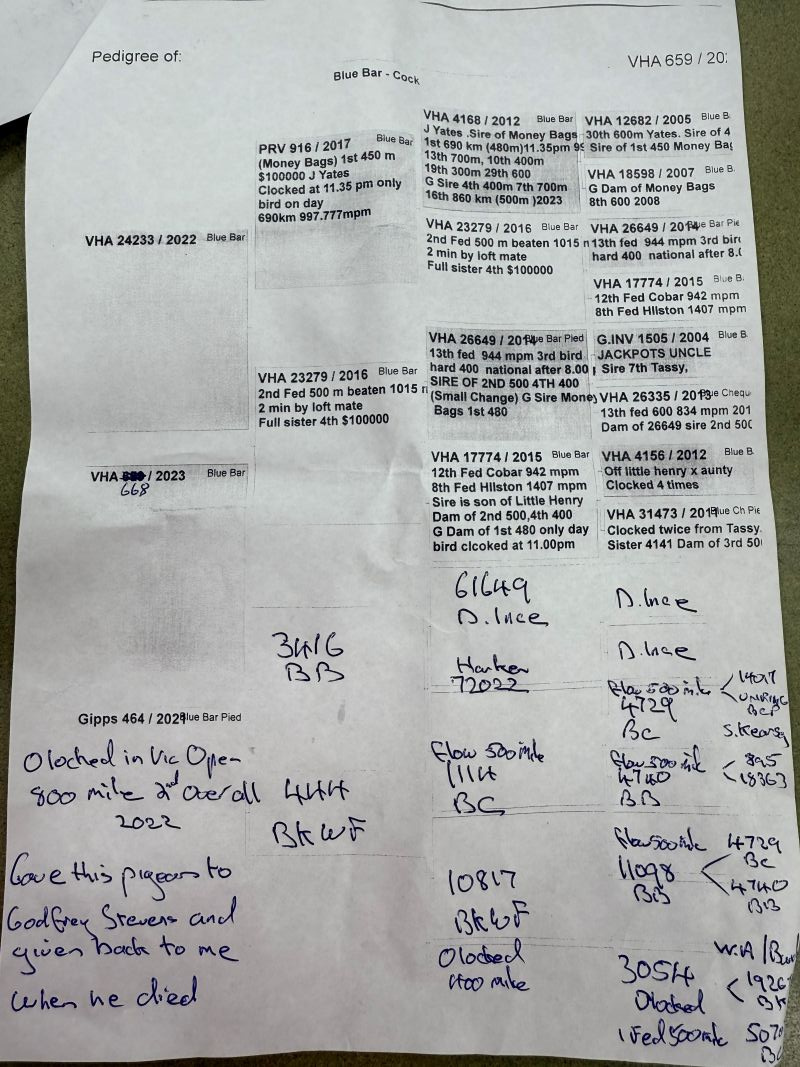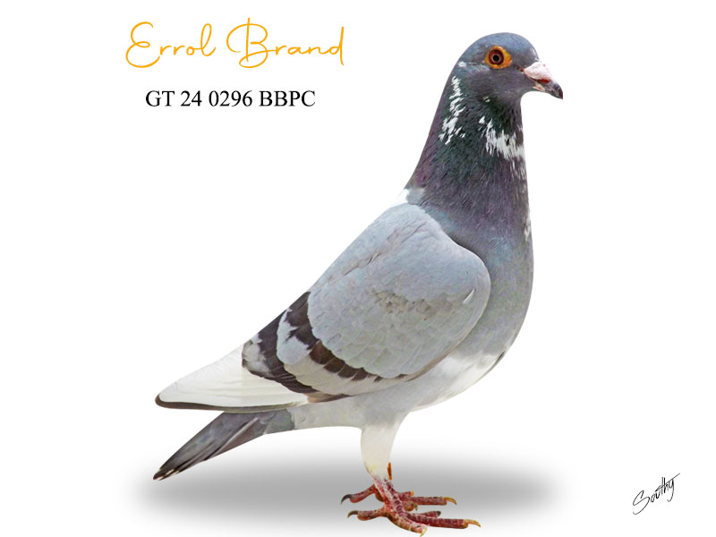 Lot 5:  GT 24 0296 BBPC-Errol Brand.  Top long distance lines. Sire is a son of 1st Fed Tassie who has produced Alice Springs placed birds for Whitechurch Family, all down from top Harkom/Ince lines.  Dam is combination of all top long distance fed placed birds from John Yates & Godfrey Stevens down from a long line of winning birds.