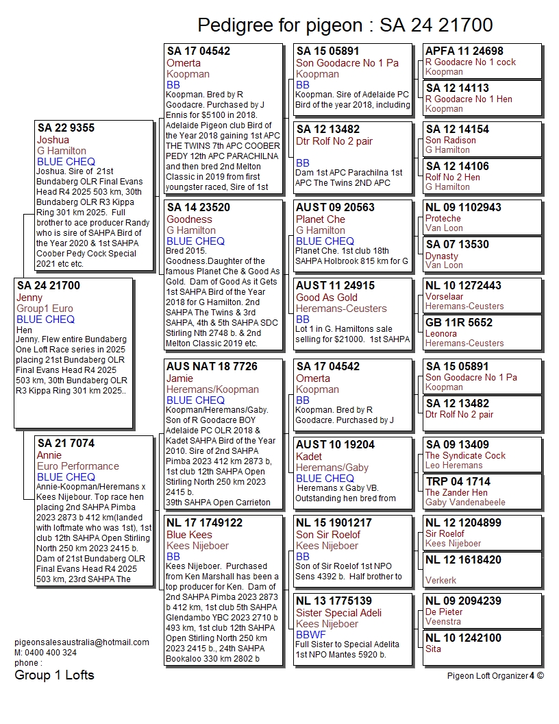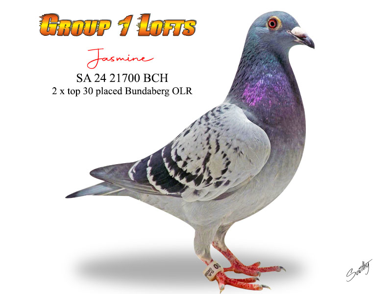 Lot 5: SA 24 21700 BCH-Jasmine. Group 1 Euro. Raced entire Bundaberg OLR series in 2025 placing  21st Bundaberg OLR Final Evans Head R4 2025 503 km, 30th Bundaberg OLR R3 Kippa Ring 301 km 2025. Sire is Joshua. Sire of 21st Bundaberg OLR Final Evans Head R4 2025 503 km, 30th Bundaberg OLR R3 Kippa Ring 301 km 2025. Full brother to ace producer Randy who is sire of SAHPA Bird of the Year 2020 & 1st SAHPA Coober Pedy Cock Special 2021 etc etc. Dam is Annie-Koopman/Heremans x Kees Nijebour. Top race hen placing 2nd SAHPA Pimba 2023 2873 b 412 km(landed with loftmate who was 1st), 1st club 12th SAHPA Open Stirling North 250 km 2023 2415 b. Dam of 21st Bundaberg OLR Final Evans Head R4 2025 503 km, 23rd SAHPA The Twins Open #2 2024 1169 b 610 km, 30th Bundaberg OLR R3 Kippa Ring 301 km 2025. Flew 13 races in 2 seasons clocked 4 times.