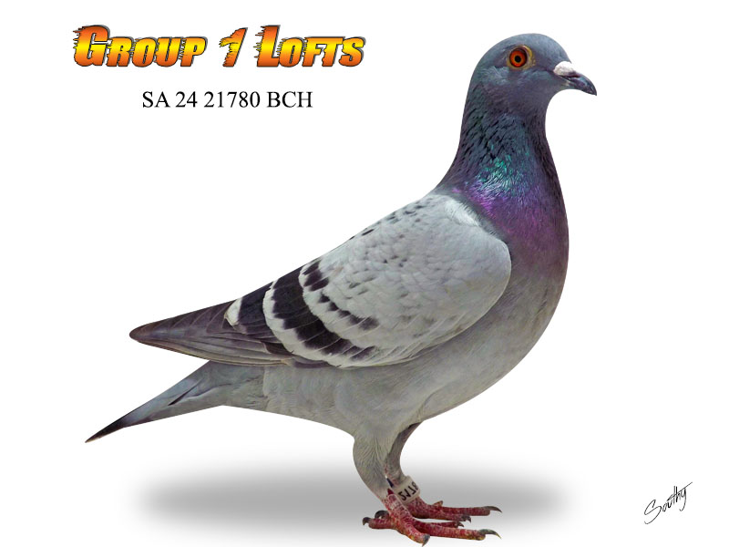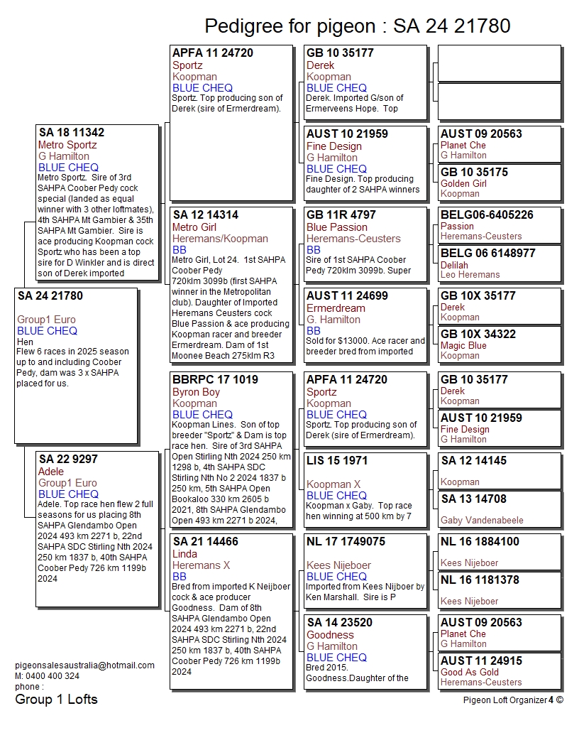 Lot 9:  SA 24 21780 BCH-Flew 6 races in 2025 season up to and including Coober Pedy, dam was 3 x SAHPA placed for us. Sire is Metro Sportz.  Sire of 3rd SAHPA Coober Pedy cock special (landed as equal winner with 3 other loftmates), 4th SAHPA Mt Gambier & 35th SAHPA Mt Gambier.  Sire is ace producing Koopman cock Sportz who has been a top sire for D Winkler and is direct son of Derek imported Koopman cock & Fine Design dam of 1st SAHPA Coober Pedy daughter of Planet Che & Golden Girl.  Dam is ace racer and producer Metro Girl 1st SAHPA Coober Pedy 720 km 3099 b, ace producing hen Dam of 3rd SAHPA The Twins 620 km & G/dam of 1st SAHPA The Twins 620 km etc, Heremans x Koopman lines, daughter of Blue Passion & Ermerdream.  Top lines.  Dam  is Adele. Top race hen flew 2 full seasons for us placing 8th SAHPA Glendambo Open 2024 493 km 2271 b, 22nd SAHPA SDC Stirling Nth 2024 250 km 1837 b, 40th SAHPA Coober Pedy 726 km 1199b 2024, daughter of top breeder Byron Boy & Linda.